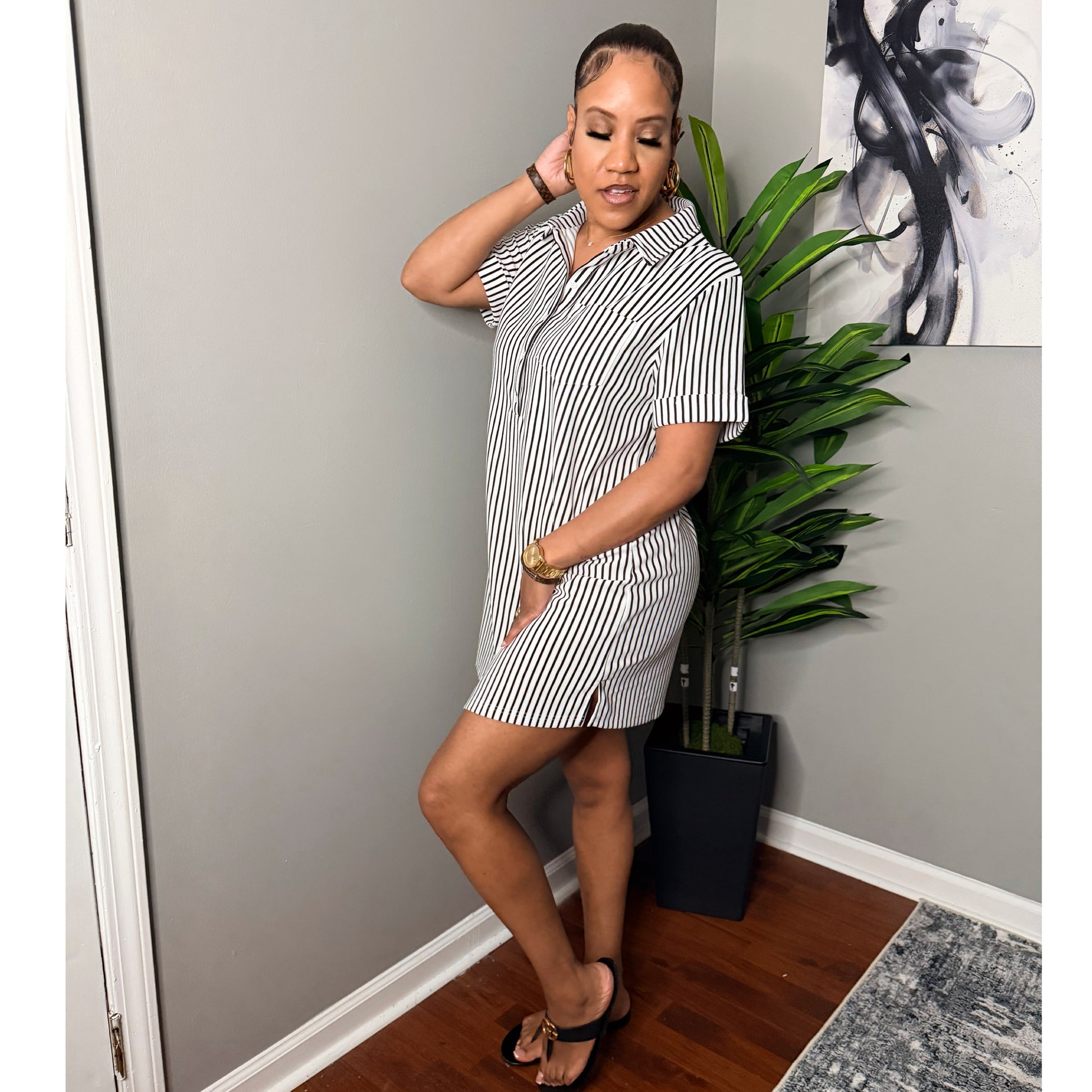 striped collared button up t shirt dress